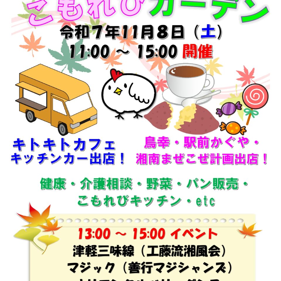こもれびガーデン11月8日(土)11時より恒例の秋祭り「こもれびガーデン」を開催します! キッチンカーやお食事の出店、野菜やパンの販売など盛りだくさん! 13時からは楽しいイベントも行いますので皆様お誘い合わせの上ぜひお越しください